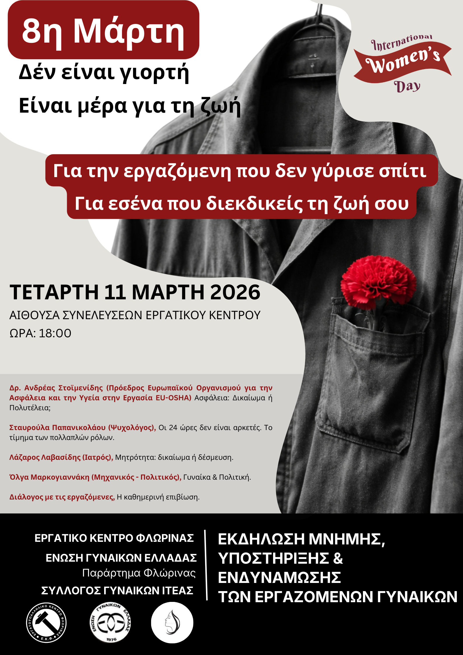 Φέτος, η 8η Μάρτη στη Φλώρινα δεν είναι ημέρα για τυπικές ευχές. Με τη σκέψη στις εργαζόμενες γυναίκες που δεν επέστρεψαν ποτέ από τη βάρδιά τους στο σπίτι, ανοίγουμε τη συζήτηση για το δικαίωμα στην ασφάλεια, την προστασία της μητρότητας και την ανάγκη για ουσιαστική πολιτική διεκδίκηση.